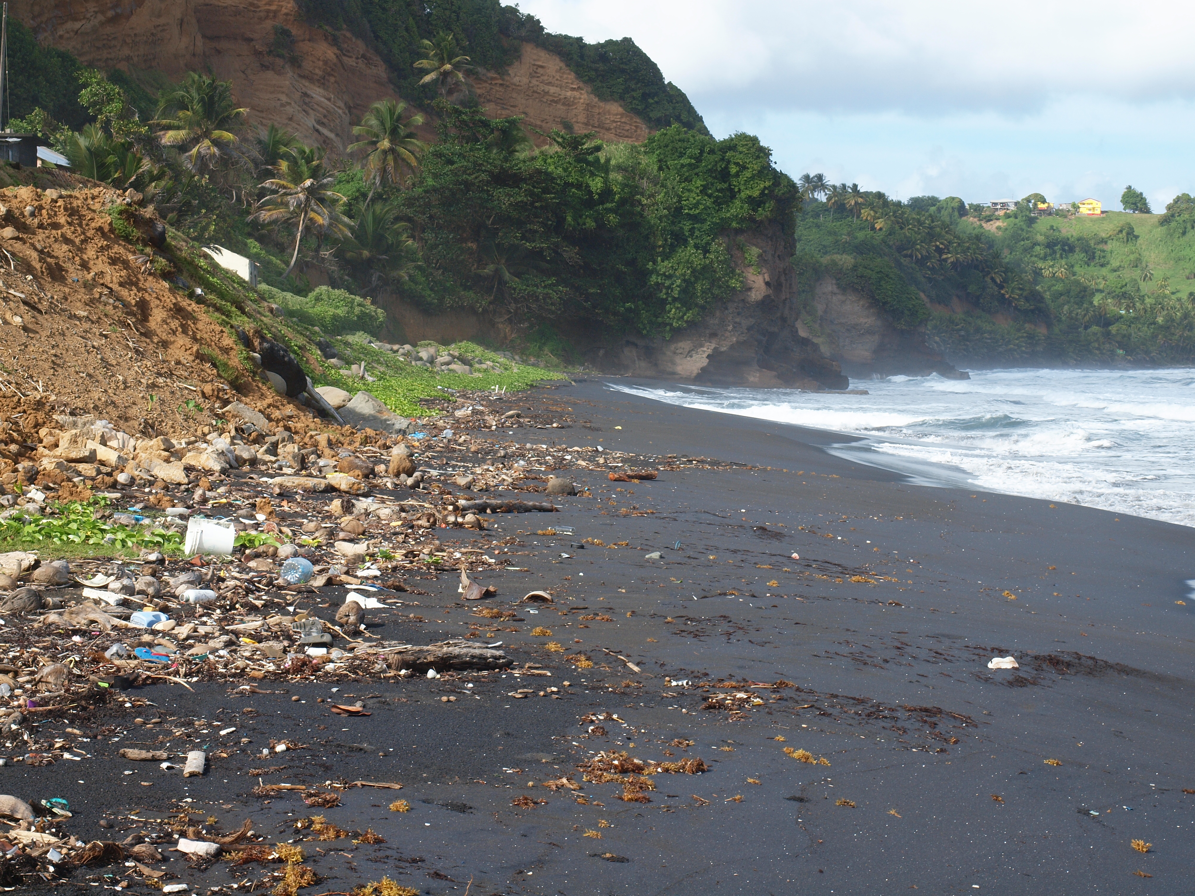 San Souci beach on the East coast of Saint Vincent mainland is a major ecologically valuable nesting beach for leatherback turtles. The beach had been cleaned only two months before the visit and plastics and other waste from all over the world had reassembled in a short time. |