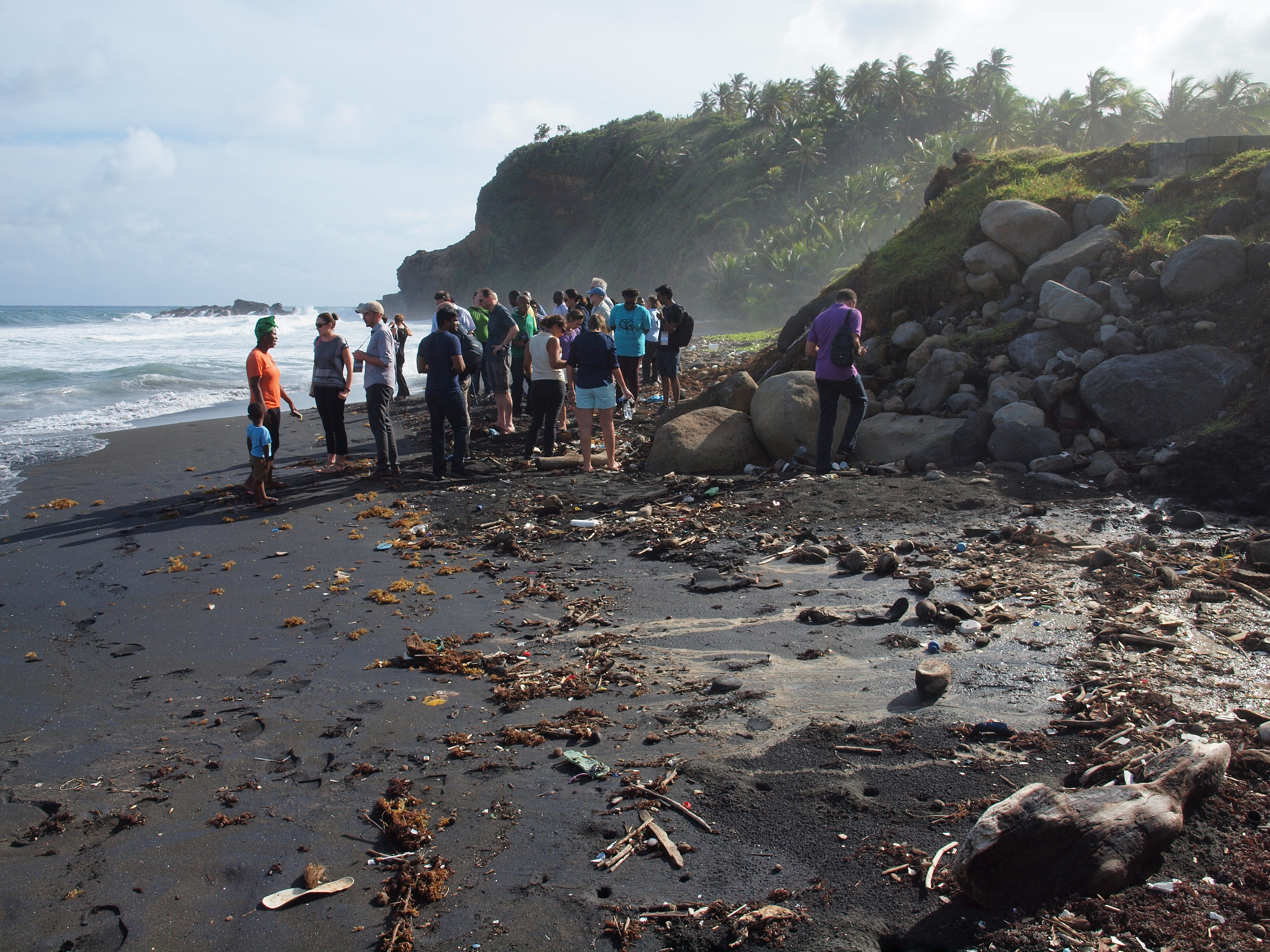 At San Souci beach, Robin Hoflund and Louise Mitchell pointed out issues with a large amount of waste deposited on the beach by the ocean. This waste, which to a large extent consists of many forms of plastics originating in different and often far-away parts of the globe poses risks to the leatherback turtles during their brief visits to the beach for nesting. Likewise, activities on land impact the beach and expose the turtles to risks and disturbances. The recent changes in extreme weather events further puts stress on the beach environment.